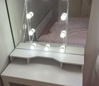 Coiffeuse avec miroir avec lumière led 1 tiroir Miroir pliable En bon état Interrupteur lumière un peu abîmé voir photo mais fonctionne. Remise en mains propres uniquement