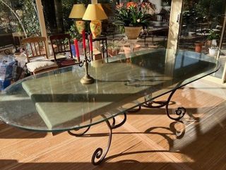 grande table (10,12 personnes), composée d'un pied en fer forgé, d'un plateau en bois exotique rectangulaire, recouverte d'un épais verre ovale. Très lourde mais possible à transpo