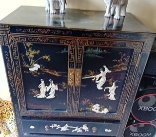 Très joli petit meuble de chinois. Avec sculpture, nacre de porte, 2 tiroirs.