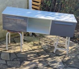 Meuble bas télévision 2 portes laquées grises Au milieu l étagère est en verre Occasion comme neuf