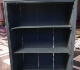 Petite étagère pour ranger de petits objets. A poser ou à suspendre (crochet au dos). Avec petites moulures en haut, comme une balustrade En bois peint en gris foncé Hauteur : 61