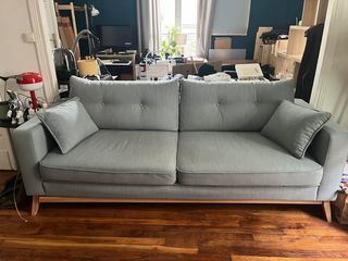 Vends 2 jolis canapés 3 places Tissu gris clair Parfait état. Non demontables 900€ les 2 - 500€ si un seul. 4 coussins decoratifs offerts par canapé. Dimensions : L220 / H