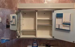 Vends grande armoire de salle de bains. 3 portes, 3 miroirs, plusieurs etagères + emplacement porte brosses a dents. Lumière sur le dessus sur toute la longueur, prises intérieures