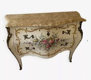 Commode Vénitienne Bois Peint à Décor Floral Et Marbre - Style Louis XV -Baroque