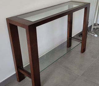 Modèle unique (fait sur plan par menuisier) Console contemporaine Dimensions 114 x 32 x 80 Deux plateaux verres Très belle pièce