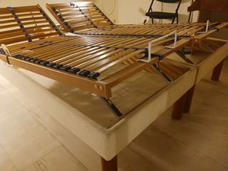 Lit double relaxation tapissier manuel. Longueur 200 cm, Largeur 160 cm, composé de: 2 sommiers Longueur 200 cm x largeur 80 cm, avec chacun 4 pieds cylindriques de hauteur 25,5 c
