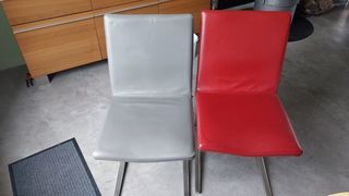 Ensemble de 6 chaises en cuir de marque BOCONCEPT : 4 chaises de couleur grise + deux housses cuir grise en réserve 2 chaises de couleur rouge