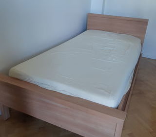 Chambre en bois stratifié de couleur chêne clair composée : - un lit 190 cm x 90 cm avec 2 tiroirs en dessous - un bureau avec un caisson de rangement de chaque côté : - dimensi