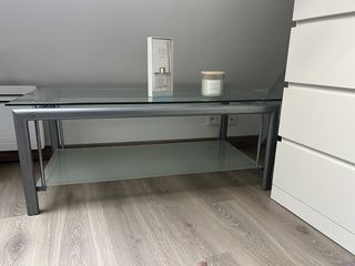 Bonjour, Je vends cette table en verre et métal à deux étages en très bon etat. 119x60x45cm À venir chercher sur place à Leuville sur orge Paiement sur place