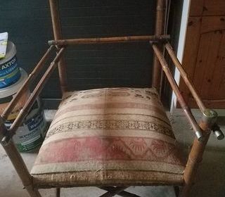 Ancienne. Avec des embouts métalliques (laiton ?). Hauteur totale : 100 cm. Hauteur de l'assise : 45 cm Largeur de l'assise : 50 cm Il y a des ressorts sous le tissu. Etat m