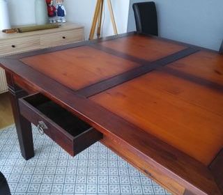 Très belle table ronde en merisier massif, diamètre 120 cm, en excellent état. Il s'agit d'un meuble de qualité, fabriqué par Barré-Dugué. Caractéristiques : Bois : merisier