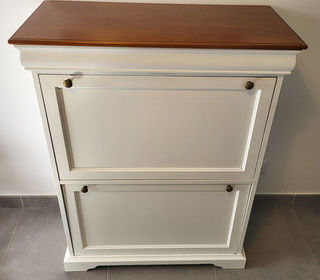 Je vends ce meuble à chaussures blanc avec plateau en bois marron, parfait pour organiser votre entrée avec style et fonctionnalité. 78 x 37 x 100 cm - Type de produit : Meub
