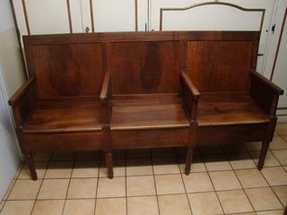 Stalle ancienne en noyer massif (Epoque 1820) Stalle de 3 places. Pieds tournés, accoudoirs à balustres. Couvercle sur chaque assise avec espace de rangement. Nous nous en