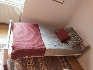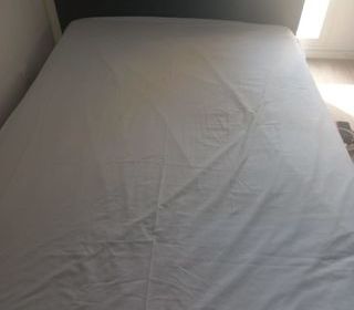 Lit une place, sommier lattes bois, cadre bois blanc et gris. Peut être vendu avec tiroir pouvant contenir un matelas supplémentaire.