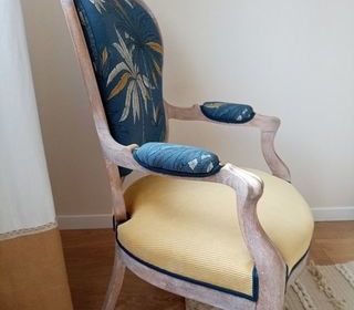 Fauteuil cabriolet restauré méthode semi traditionnelle ( sangles ressorts mousse haute densité) Possibilité de faire 4 coussins (2 jaune 2 imprimés) avec chutes tissus.