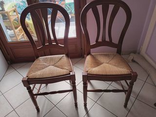 Bonsoir Vends 2 chaises couleur bois de merisier parfait état..assise bois et paille.Pris 45 euros les 2 . A PRENDRE SUR PLACE PAS D'ENVOI Cordialement