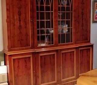 Urgent cause déménagement Bibliothèque Anglaise en If. Deux parties, haute et basse; Vitrine, étagères et tiroirs. Très bel état. Dimensions : H : 2,10 - L : 2,00 - P : 0,50.