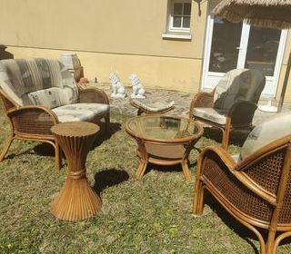 Salon exotique 4/5 places en rotin naturel tressé et vernis. Élégance et confort au rendez-vous. Ce salon est fabriqué en canne de Philippines, un matériau réputé pour sa robustes