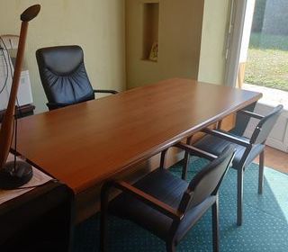 Bureau de direction couleur hêtre (200x96,5xH72,5 cm), plateau épais 5 cm, avec fauteuil à roulettes pivotant et réglable en cuir noir, 2 sièges visiteurs bois/cuir noir et caisson