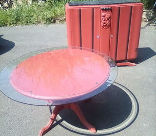 Table ronde à pieds central en bois plein. Plateau bois 115cms de diam. Sur plateau en verre 120cms de diam. Buffet bois plein Plateau en marbre noir. Très bel ensemble insp