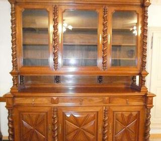 Important Buffet double corps en beau noyer, en parfait état d'origine: haut a trois portes vitrées a usage de bibliothèque ou de vitrine, bas a trois portes pleines et trois tiroi