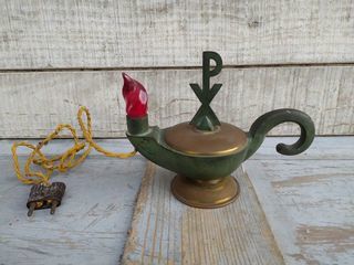 Lampe Religieuse Veilleuse de Sanctuaire Patine Bronze Antique Longueur 18cm, hauteur 14,5cm, largeur 8,5cm. Très bon état, fil électrique un peu abimé, fonctionnement non t