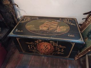 Ancien Coffre Malle de Marine Anglaise Peinte à la Main Longueur 84cm, largeur 48cm, hauteur 40cm. Bon état, fissurations et manques de peinture par endroits.