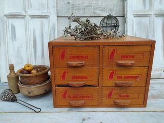 Petit Meuble à Tiroir Rangement Thé Éléphant Vintage Largeur 38cm, profondeur 29cm, hauteur 27cm. Bon état, un manque de bois sur un tiroir