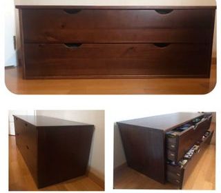 Bonjour, Meuble télé en bois massif (très lourd) Peut également servir de meuble de rangement Très stable bicolore(bois et peinture crème) Tiroir Niche fermée par portes