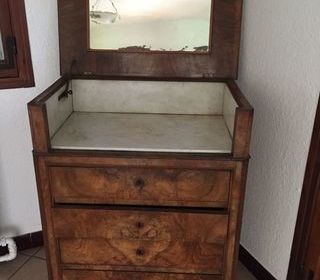 Meuble à tiroirs en ronce de noyer faisant office de coiffeuse.