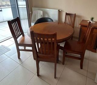 À saisir table ronde en bois avec rallonge, accompagnée de 5 chaises assorties. Parfaite pour créer un espace convivial dans votre salle à manger ou salon ! - Type de produit : Ta