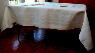 Nappe blanche ancienne lin & coton + serviettes tissu métis 240 cm x160 cm avec jours et tissu damassé 12 serviettes 60 x 60 cm l'ensemble date des années 60 -70mais n'a jamai