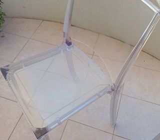 Plateau en verre transparent trempé épaisseur 15 mm Piètement laque blanc L900 x H755 x L680 Découpe originale elliptique dont un côté droit Fût-piston en acier chromé La haut