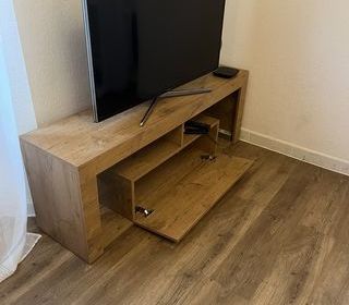 Meuble TV en bois clair avec plusieurs compartiments ouverts et fermés, idéal pour ranger des appareils électriques et des accessoires. En bon État