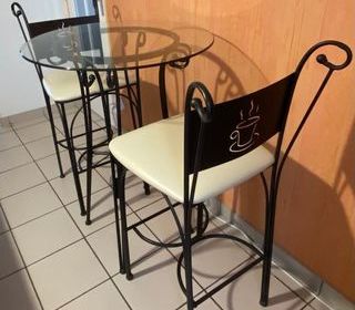Table haute en fer forgé, hauteur 102 cm, avec son plateau en verre trempé diamètre 75 cm + 2 chaises hautes en fer forgé avec assises en skai beige, le tout en très bon état. Enlè