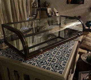Rare vitrine en verre bombé confiseur Fond miroir socle en chêne encadrement laiton très bon état