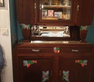 Vaisselier art deco relooke verni mat profond ainsi son decor floral souligne en couleurs. Très décoratif et original. Parfait etat, miroir dcirigine biseauté et beau marbre.Bois p