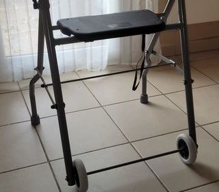 Déambulateur à deux roues avec siège intégré, structure métallique, poignées ergonomiques et patins arrières. Convient pour une utilisation en intérieur. Siège amovible entièremen