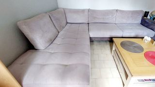 Tissu microfibre de couleur gris clair et gris foncé Longueur côté méridienne : 2.16 m Autre Longueur : 2.68 m Profondeur : 1 m Capacité d'assises : 6/7 personnes Coussins d