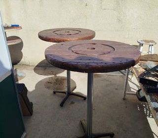 Mange debout, double plateau bois et pieds en métal, résiste aux intempéries. A la pièce où les deux.