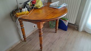 Table ronde en chêne massif + deux rallonges et deux pieds supplémentaires dimension totale 1,80 m. Très bon état.