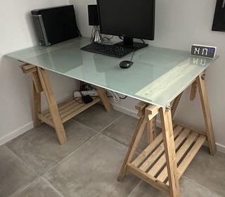Vends bureau en excellent état avec 1 tiroir et 1 porte + un emplacement supplémentaire pour y déposer cahiers. Dimensions : 1 m 22 Longueur / 55 cm Largeur / 76 cm Hauteur