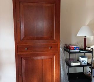 Vends Homme debout en merisier massif, en excellent état, 2 portes et 1 tiroir Hauteur = 180 cm Profondeur = 46 cm largeur = 74 cm