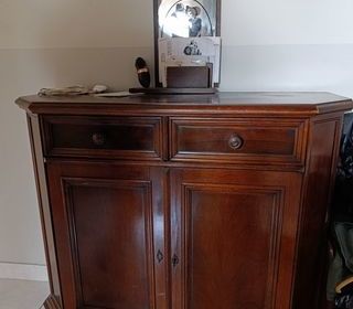 Je vends ce beau buffet/bahut en bois blanc avec miroir intégré. - Type de produit : Buffet/bahut - Matériau : Bois - Couleur : Blanc - Équipement : Miroir intégré - Nombre de