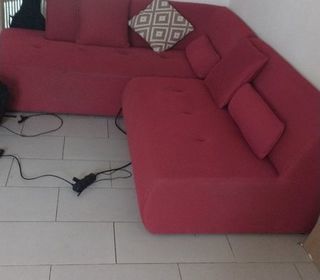 Bonjour, Je vends mon canapé pour cause de déménagement. Canapé modulable en L Tissu mailles 3D Couleur rouge Hauteur : 75 cm Largeur : 220 cm Profondeur : 198 cm 5 pla
