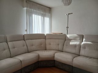 Canapé en cuir blanc et gris, en bon état, les 2 fauteuils extérieurs sont électriques, il mesure 4,05m, hauteur 1,07m, les fauteuils 0,87cms de large