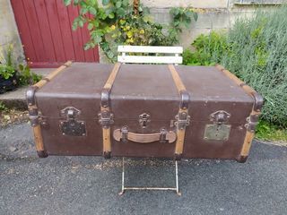Ancienne Valise Malle Coffre de Voyage Longueur 89cm, hauteur 32cm, profondeur 54cm. Bon état, il manques les deux fermoirs latéraux