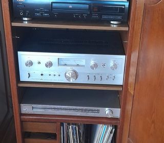 MEUBLE HI FI en chêne massif Dimensions : Hauteur : 1.17 m Largeur : 0.55 m 1 porte, 3 étagères, 2 niches, 2 tiroirs