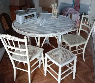Table vintage en rotin patine' blanc avec 2 chaises et 2 tabourets assortis. Diamètre de la table : 104 cm, Hauteur 75 cm. Visible à Legé 44. Règlement espèces