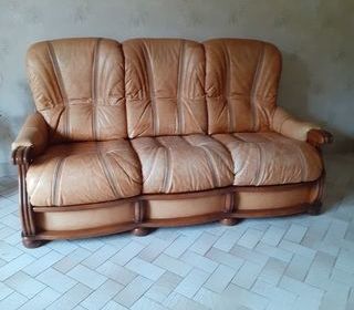 Canapé fixe en cuir vachette pleine fleur de haute qualité, dimensions ; L. 1.80 m x H. 1.00 m, avec 2 fauteuils et 1 pouf de 0.60 x 0.60. Couleur havane naturel. Très bon état,